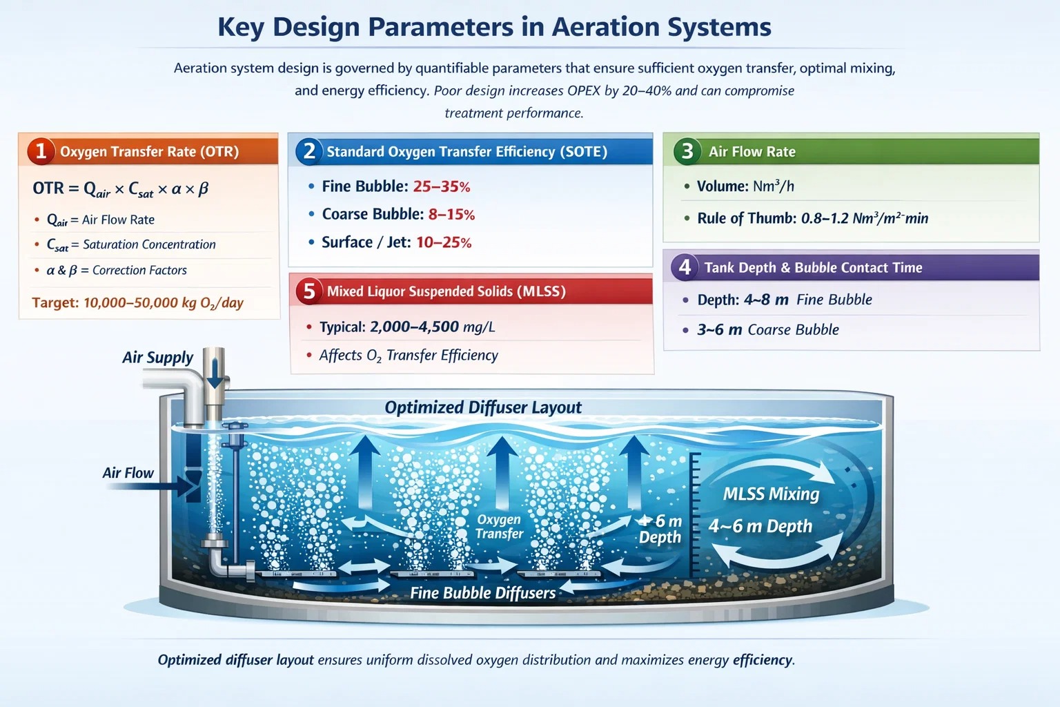 O projeto do sistema de aeração é regido por parâmetros quantificáveis que garantem transferência suficiente de oxigênio, mistura ideal e eficiência energética.