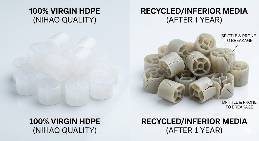 PEAD 100% virgem (Polietileno de alta densidade) é preferido porque oferece resistência mecânica superior, resistência química e a densidade correta (0,95-0,97 g/cm3) para fluidização. Os materiais reciclados geralmente contêm impurezas que tornam o meio quebradiço ou fazem com que ele afunde, levando à falha do sistema dentro de 2 a 3 anos.